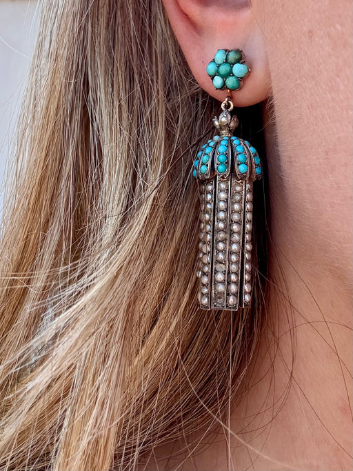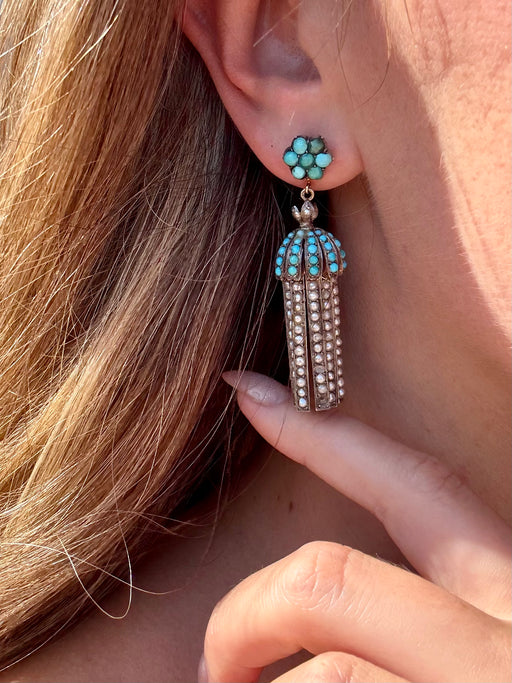 Victorian Turquoise & Pearl Earrings, Two Tone 14k & Sterling Silver