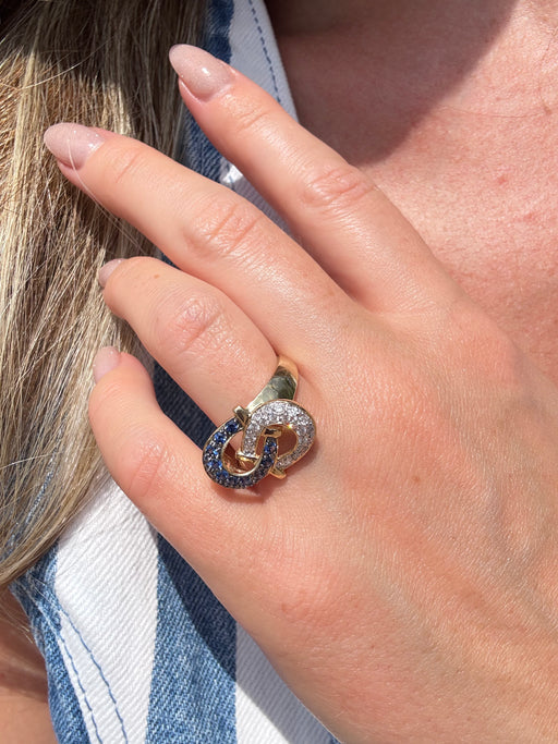 Blue Sapphire & Diamond Double Horseshoe Ring, Two Tone 14k & Platinum