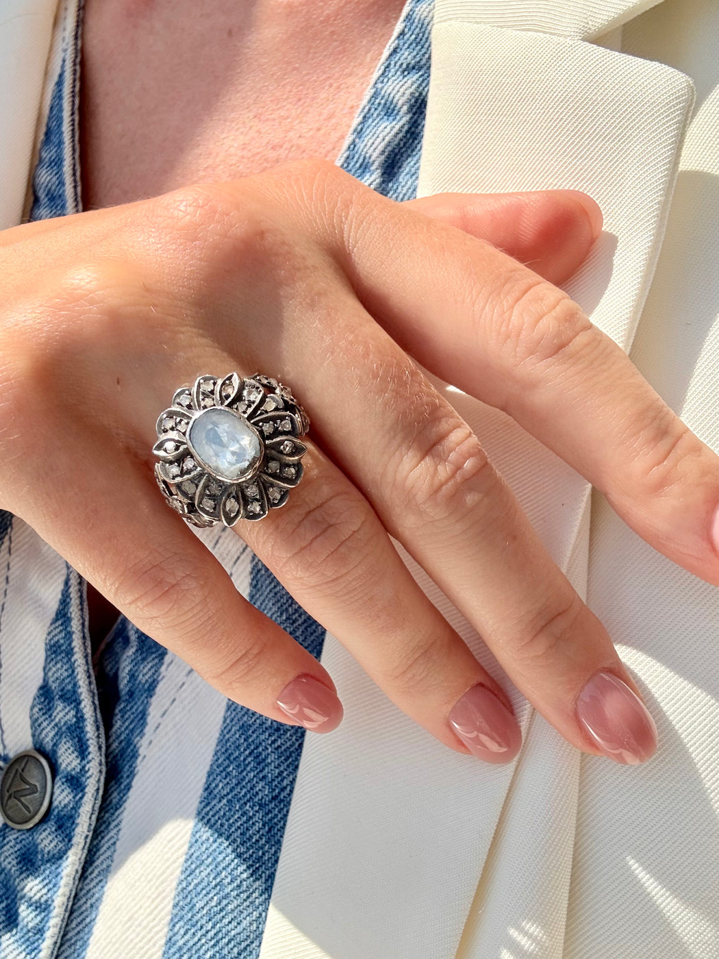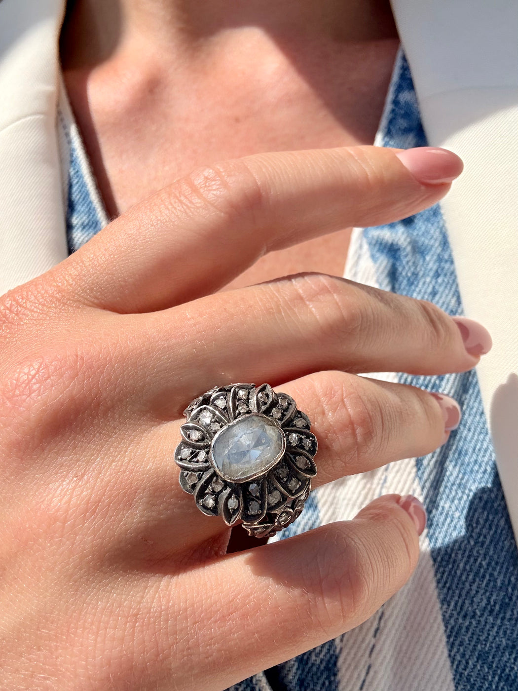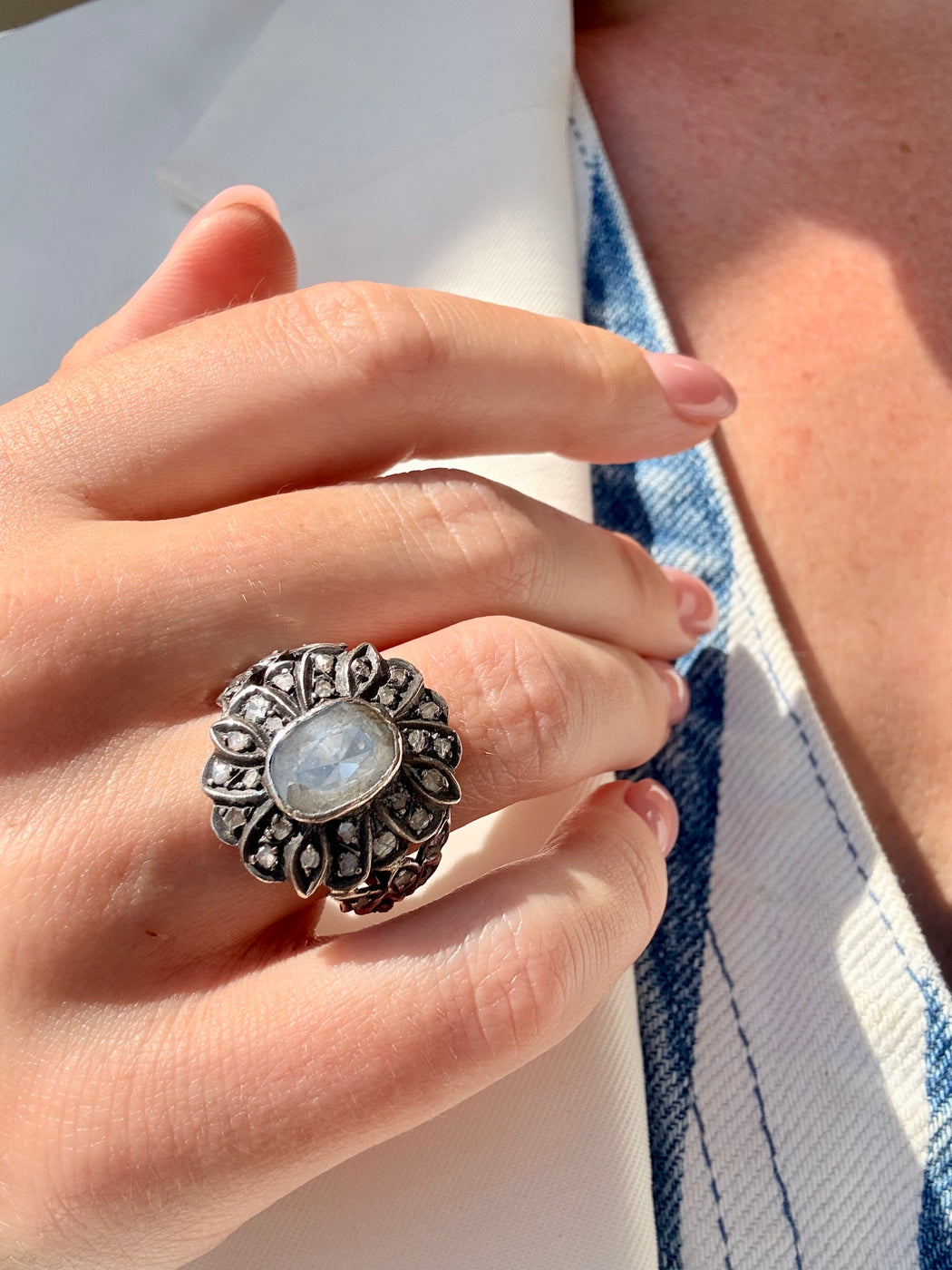 - Stones: 1.25ct Cushion Rose Cut Diamond & (34) Rose Cut Diamonds