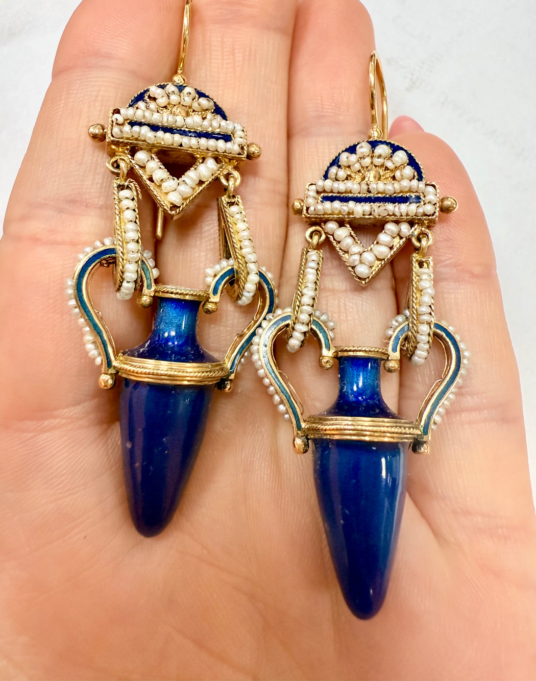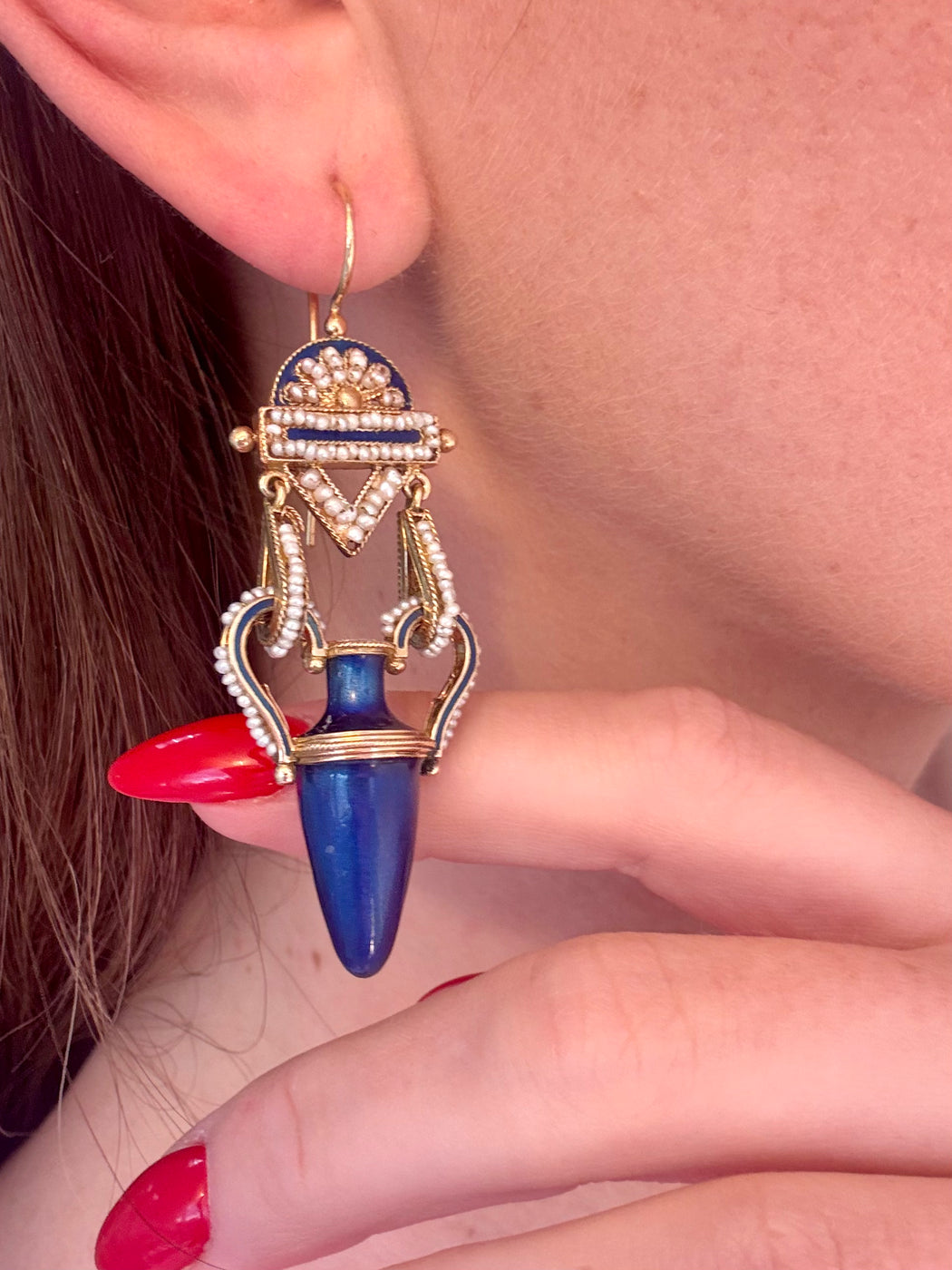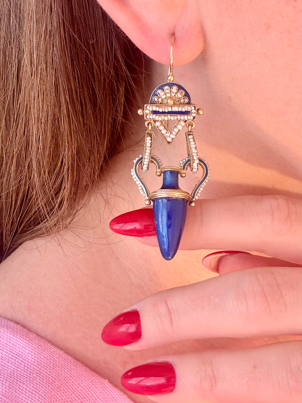Antique Blue Enamel & Pearl Urn Earrings, 18k