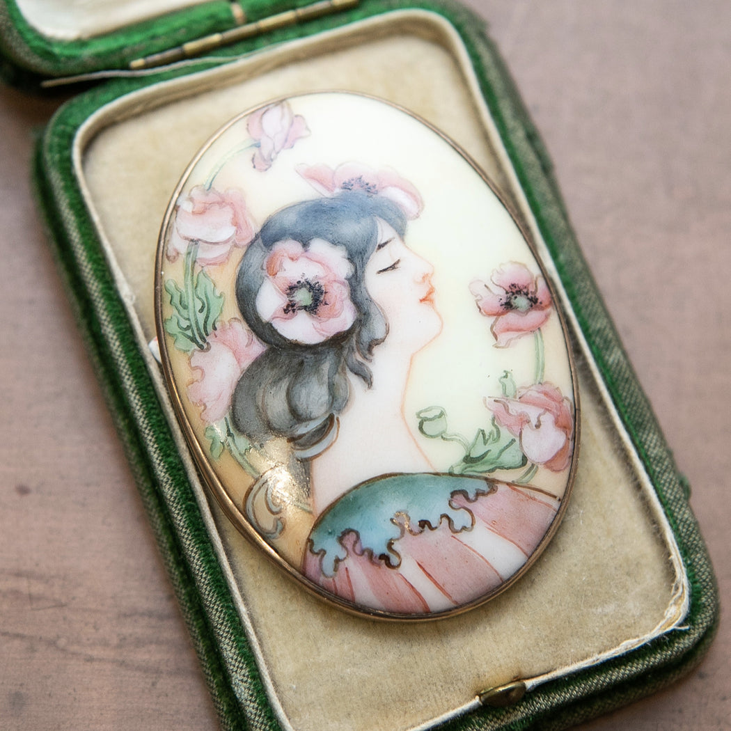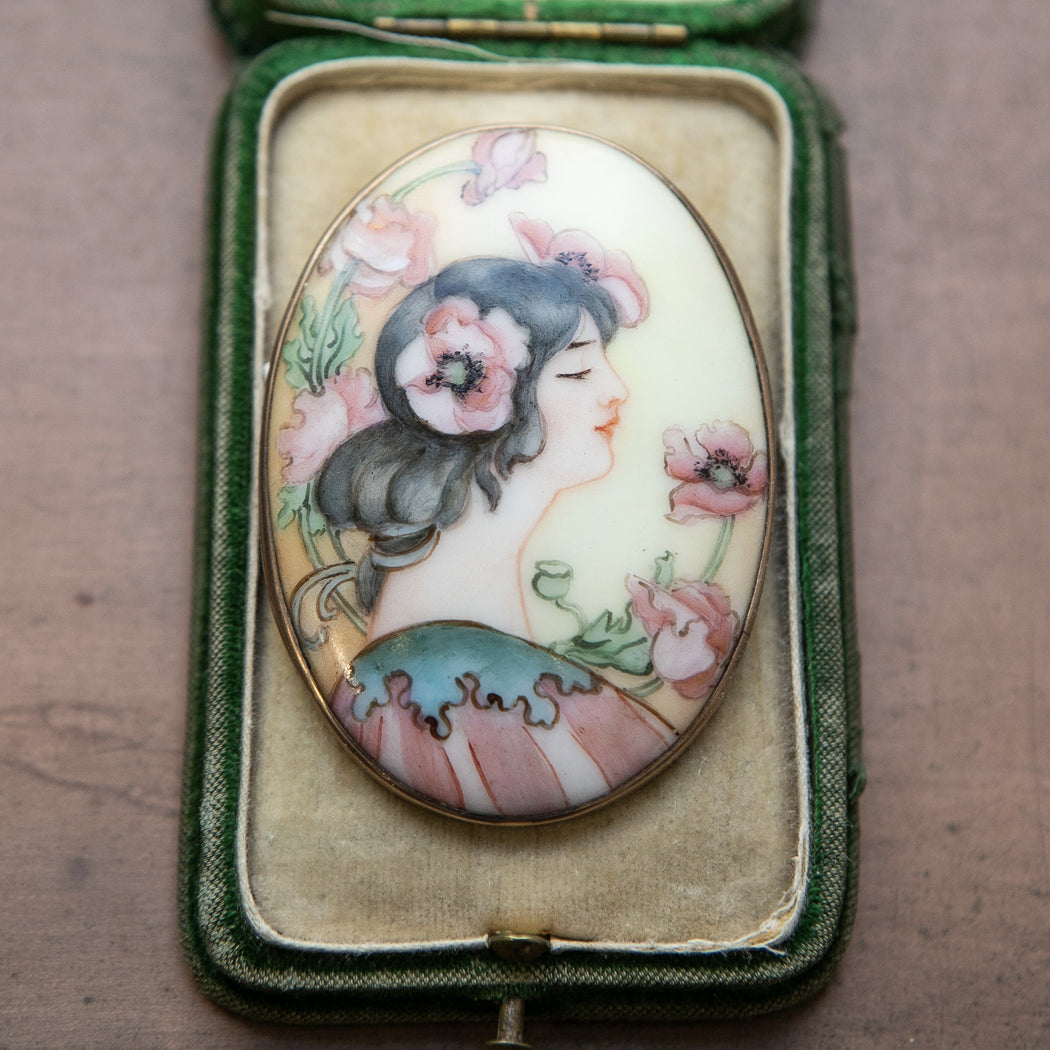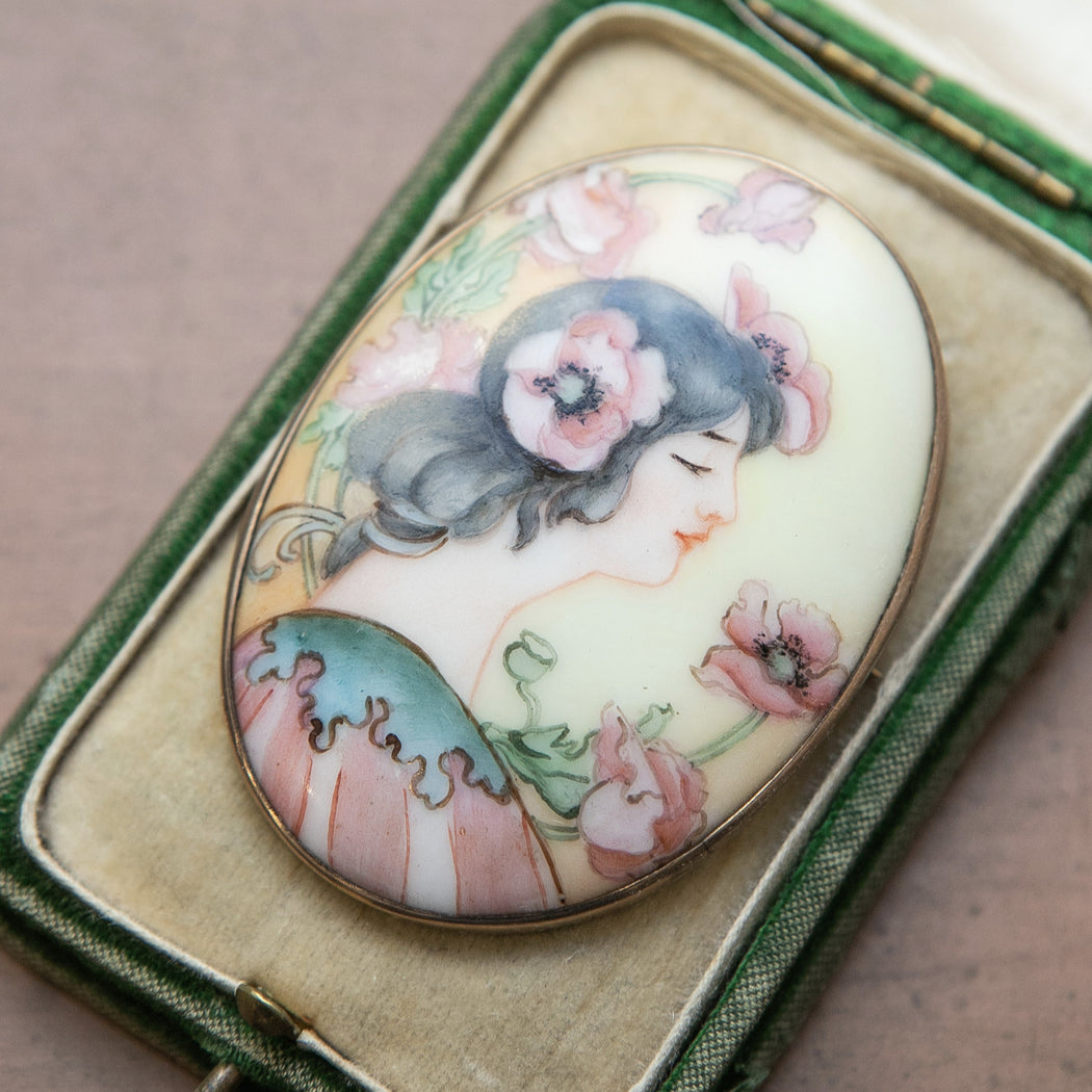 Art Nouveau Hand Painted Portrait of a Lady, 14k