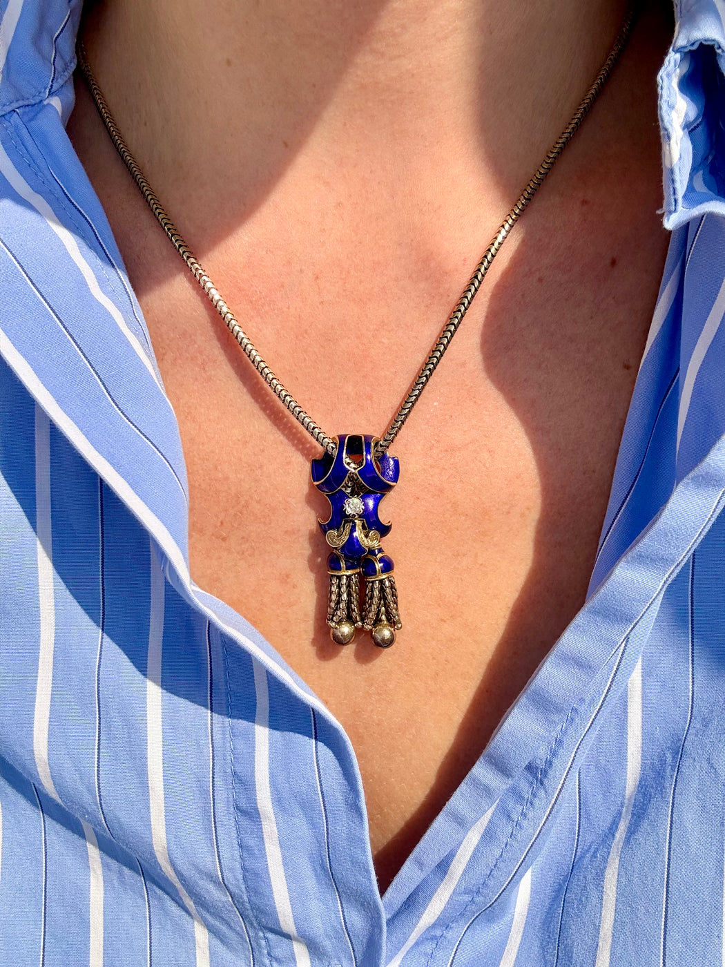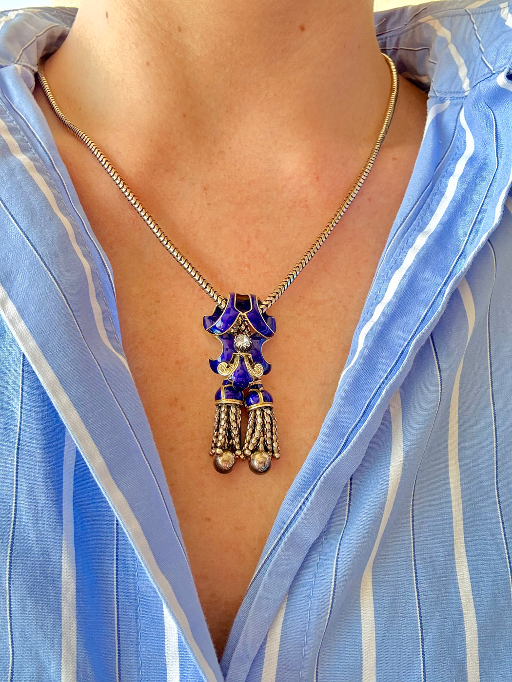 English Blue Enamel & Diamond Tassel Necklace, 15k