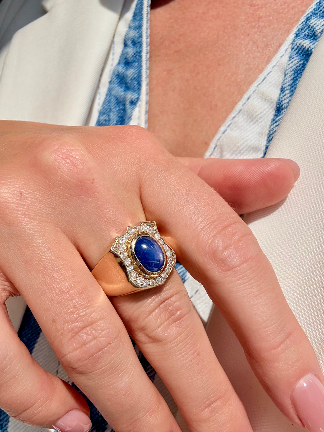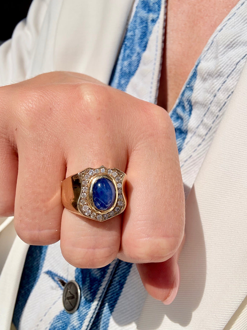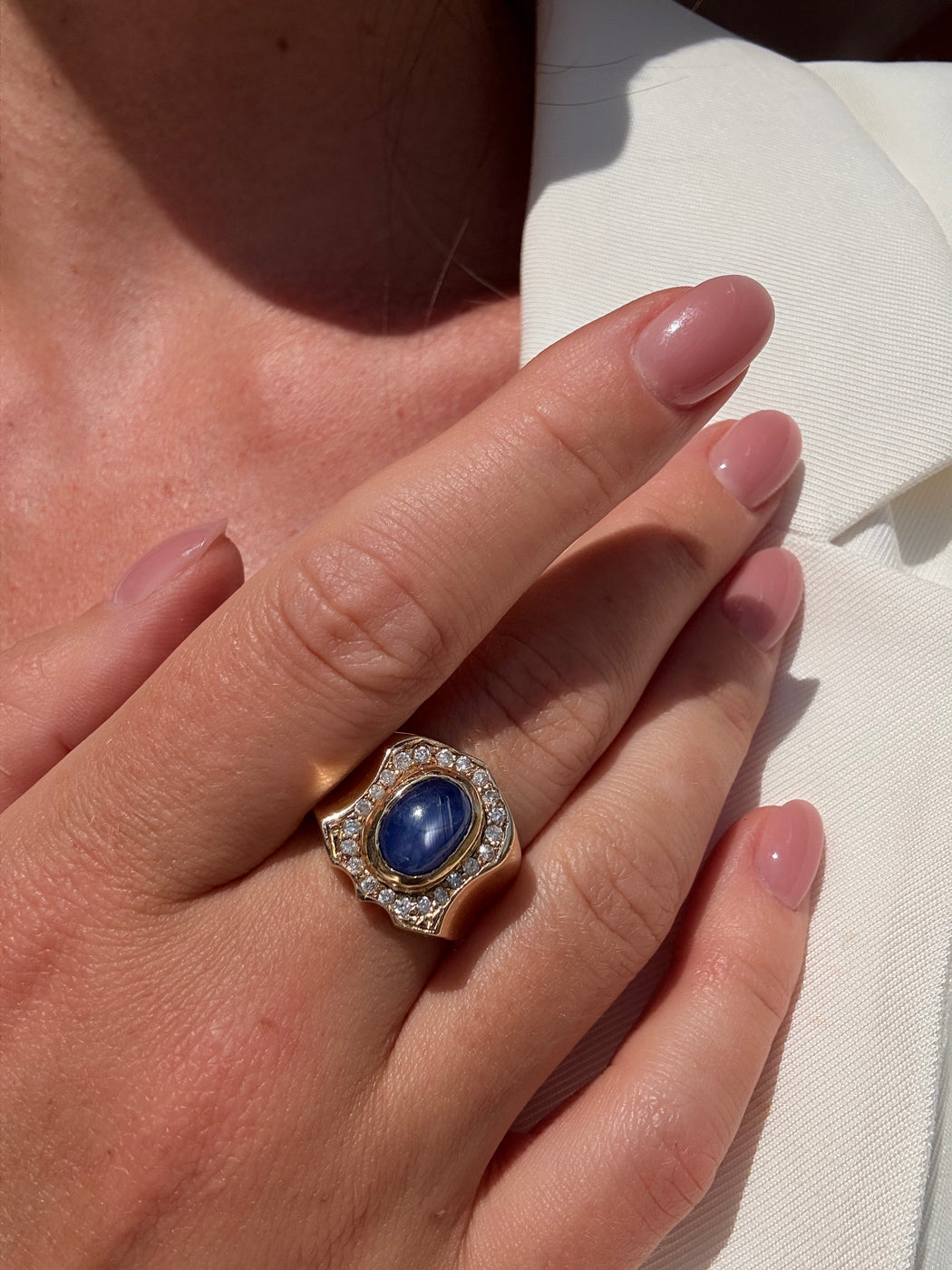- Stones: 2.0ct Sapphire Cabochon, 0.45 ctw, 22 Round Diamonds