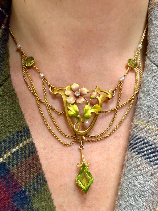 Art Nouveau Floral Enamel Festoon Necklace, 18k & 14k