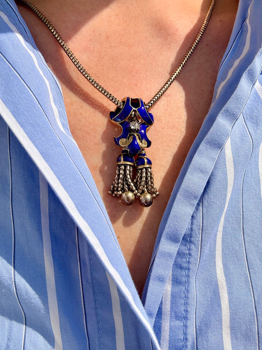 English Blue Enamel & Diamond Tassel Necklace, 15k