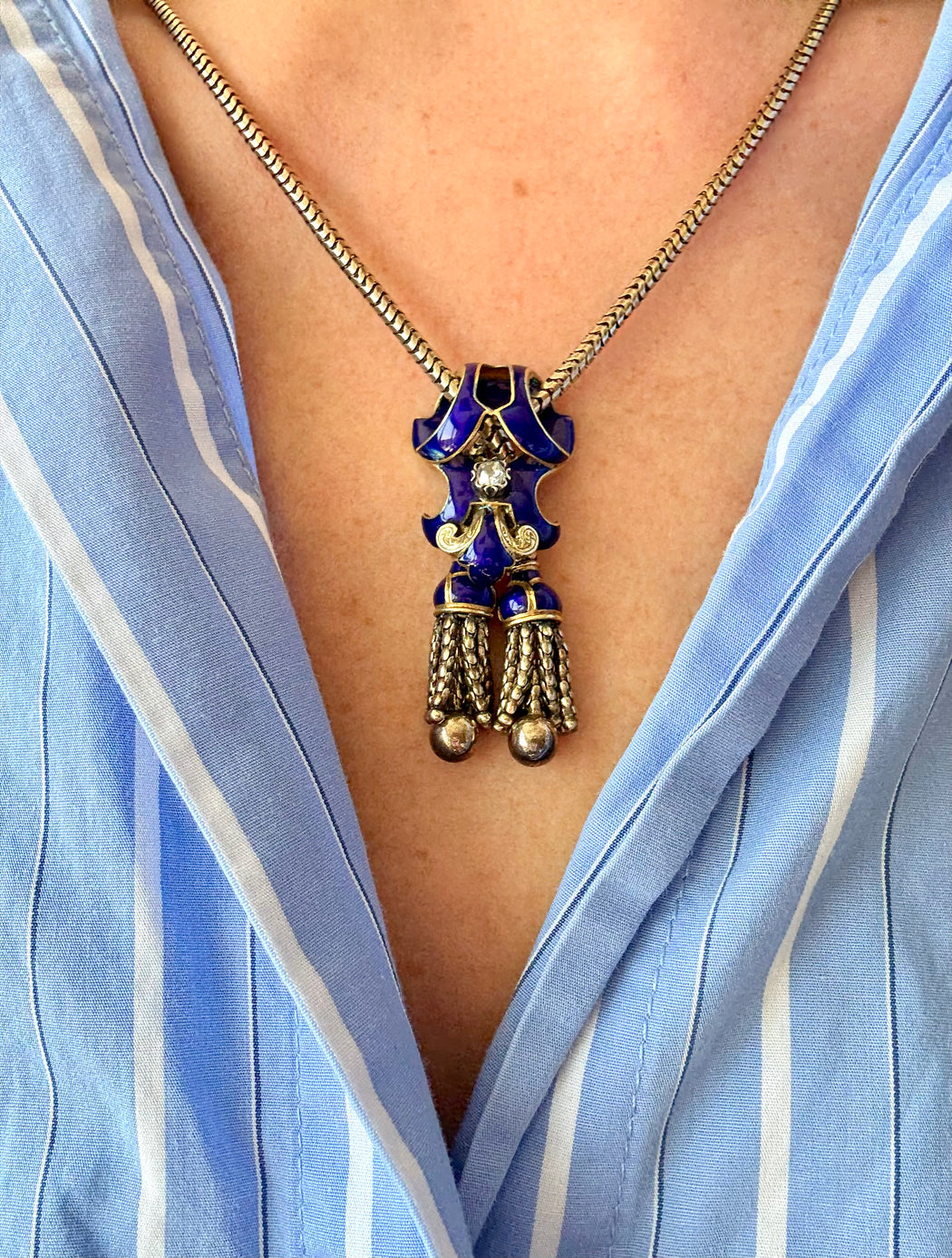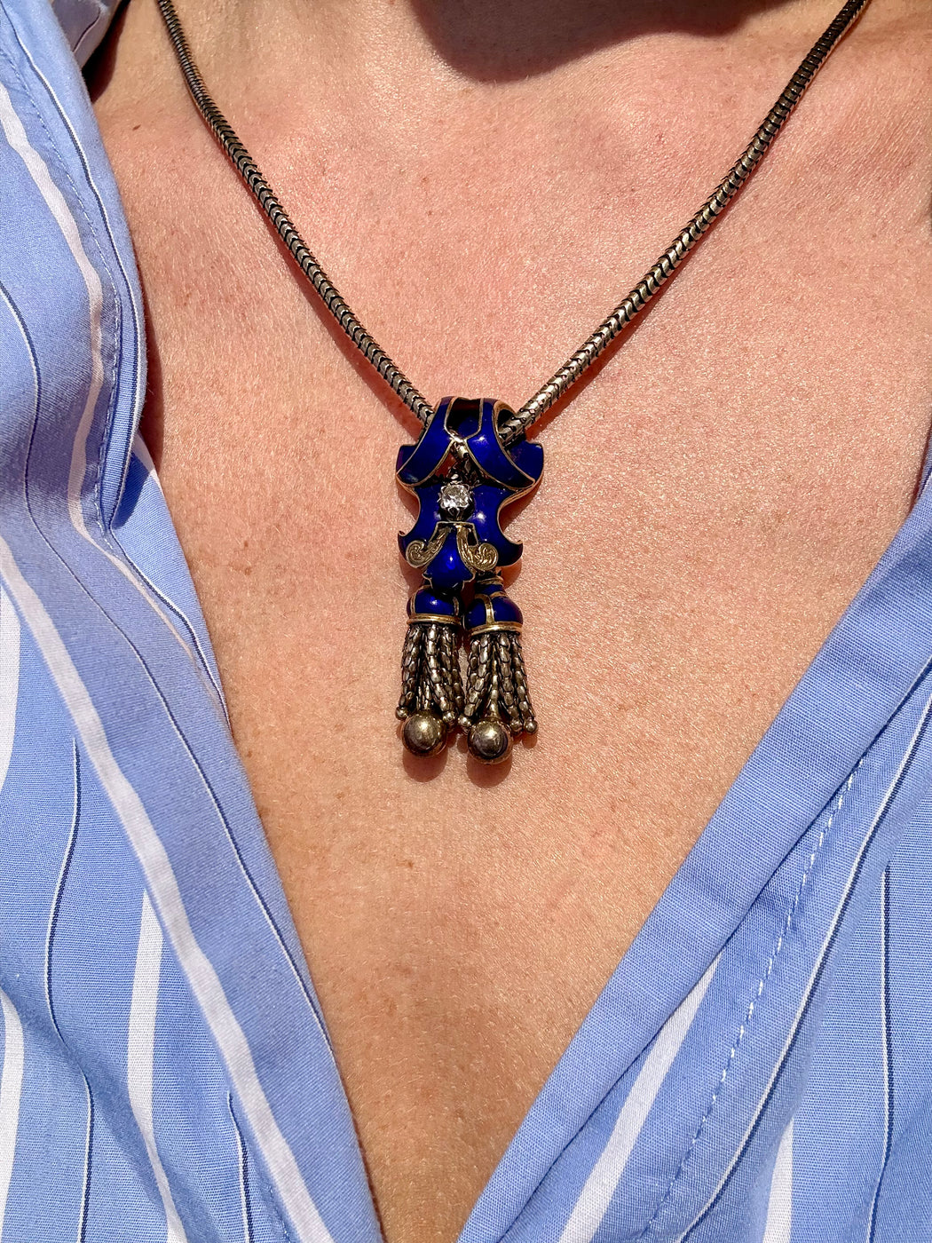 English Blue Enamel & Diamond Tassel Necklace, 15k