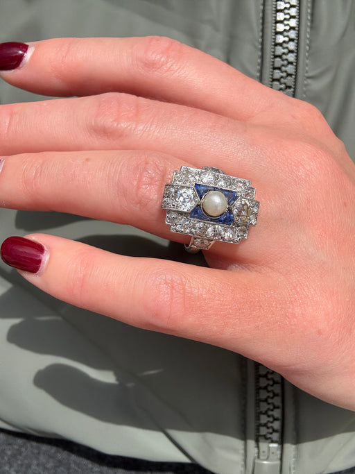 Art Deco Blue Sapphire & antique Diamond and natural pearl Ring, Platinum