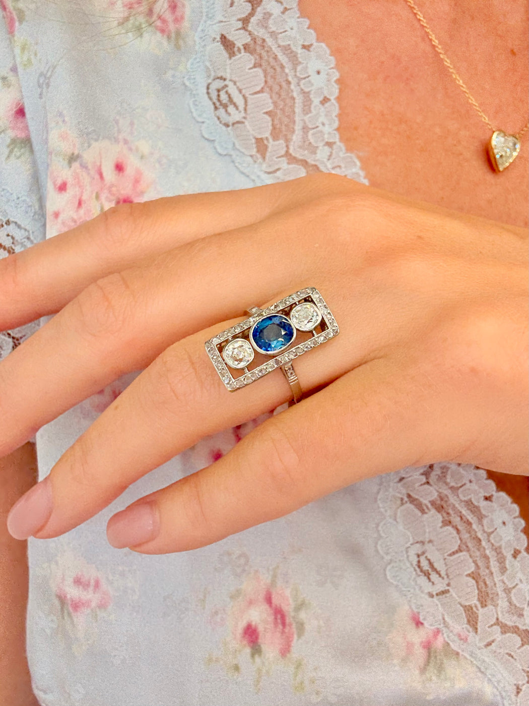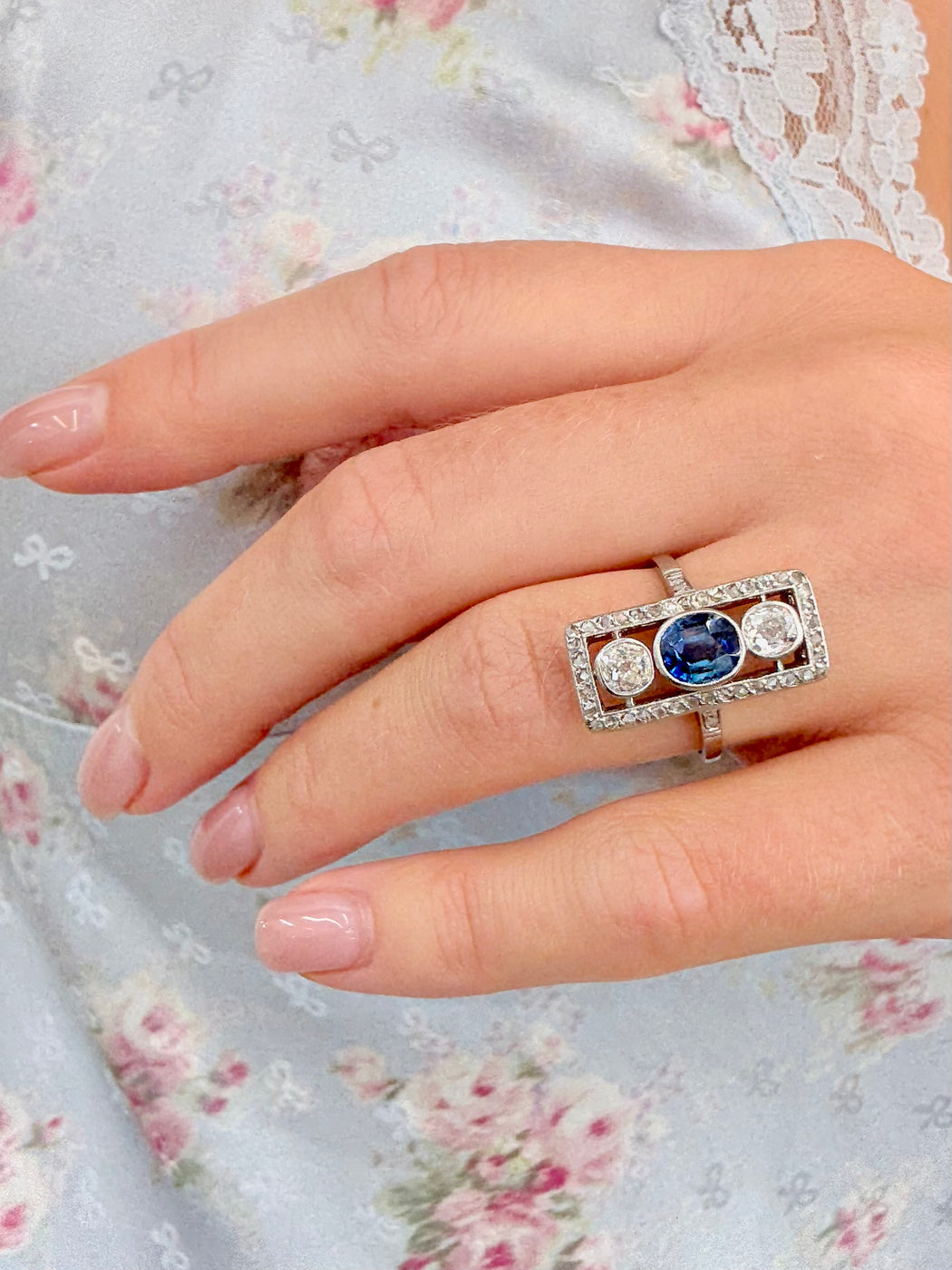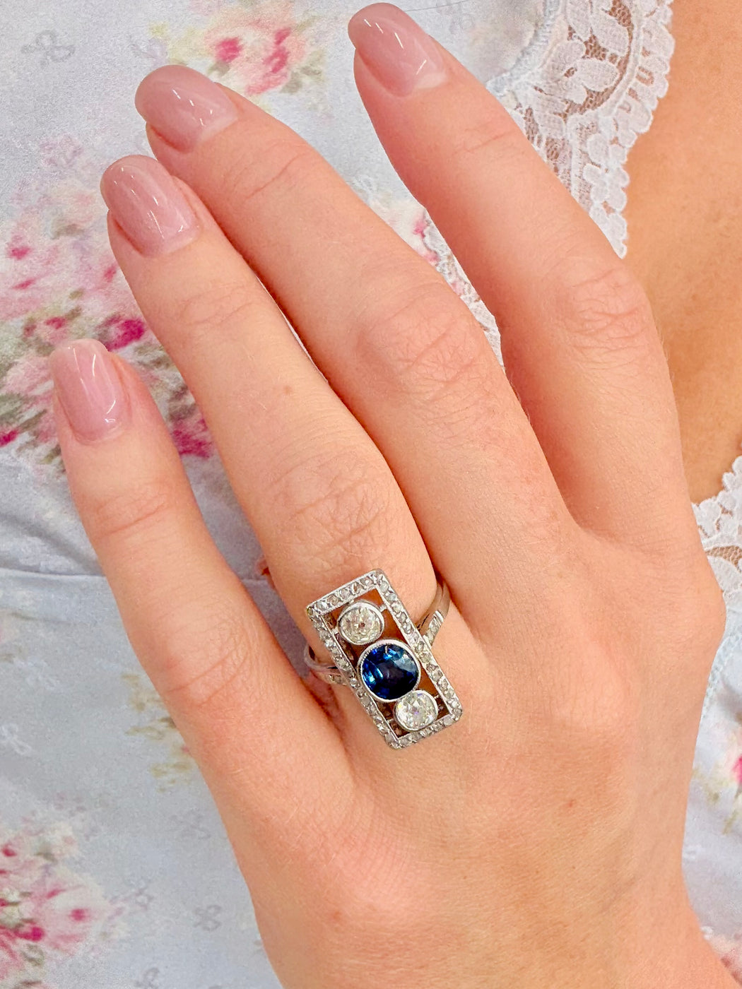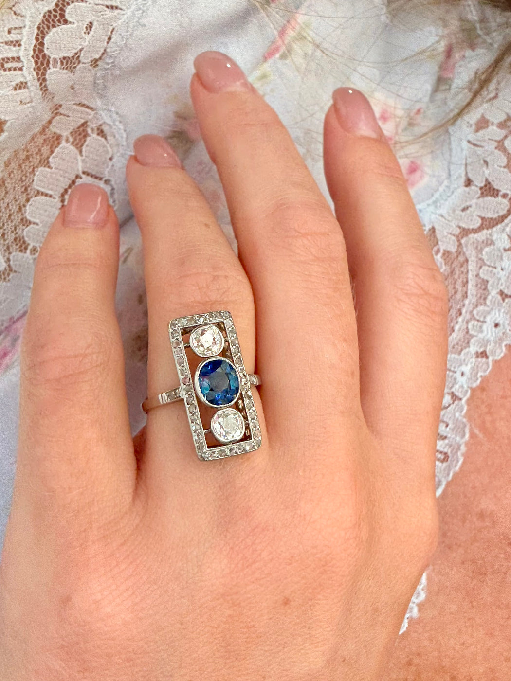 Art Deco Blue Sapphire & Diamond Ring, Platinum