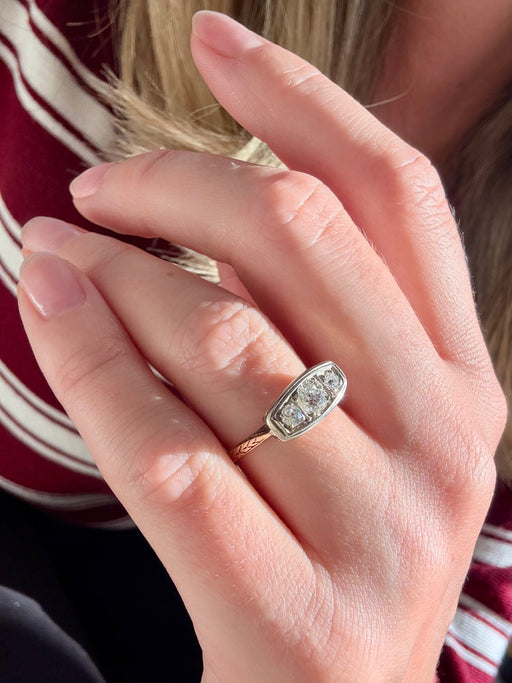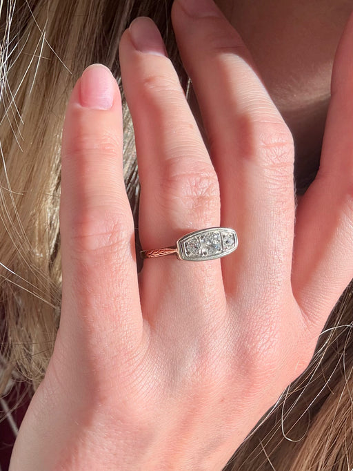 Art Deco 3 Diamond Ring, Two Tone 14k