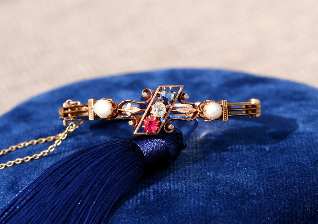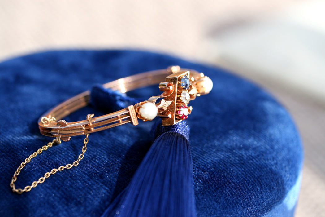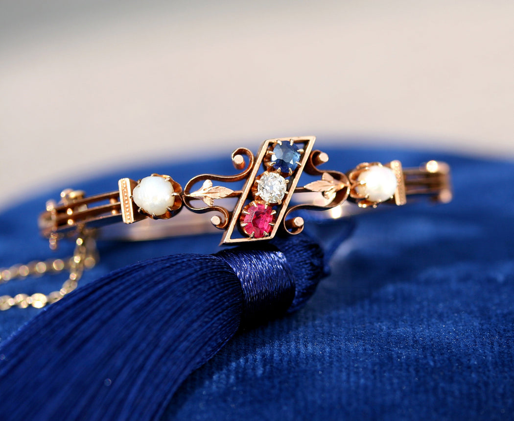 Victorian Bangle with Ruby, Sapphire, Diamond & Pearls, 12k