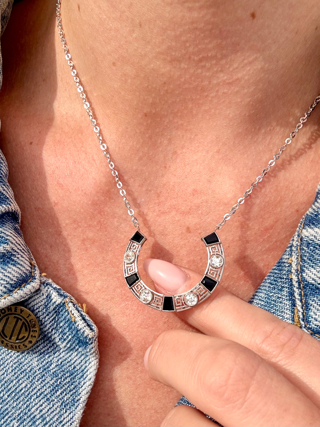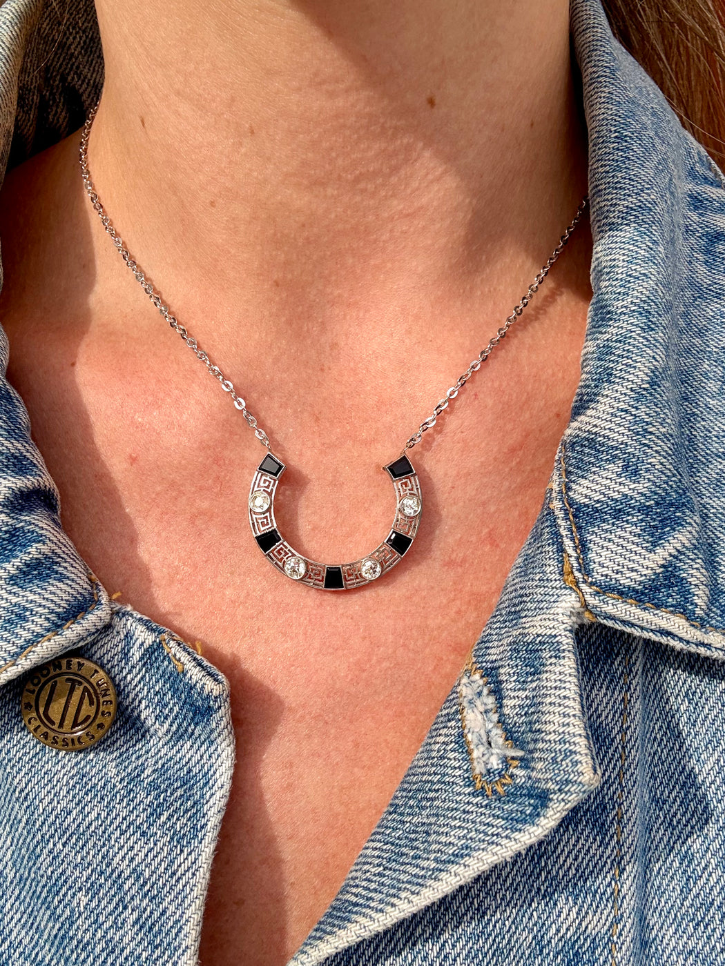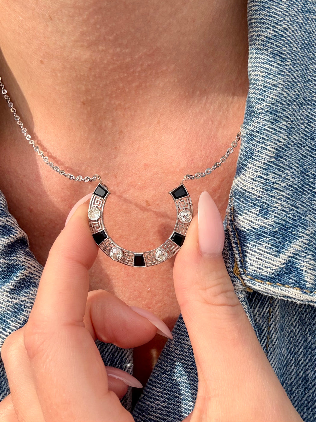 Art Deco Black Onyx & Diamond Horseshoe Pendant, Platinum