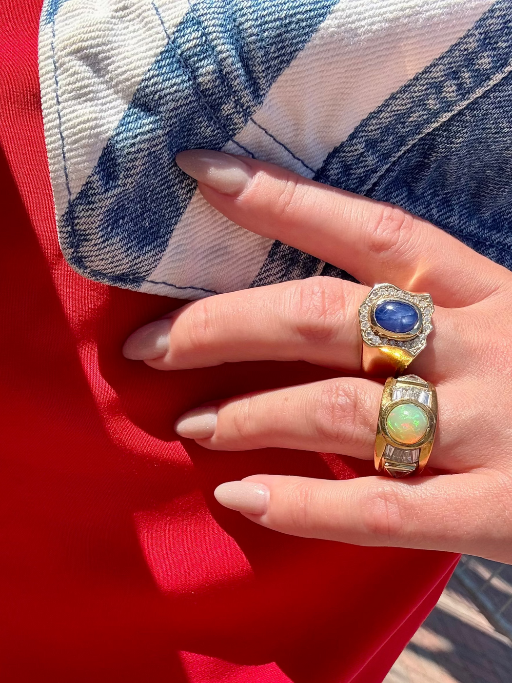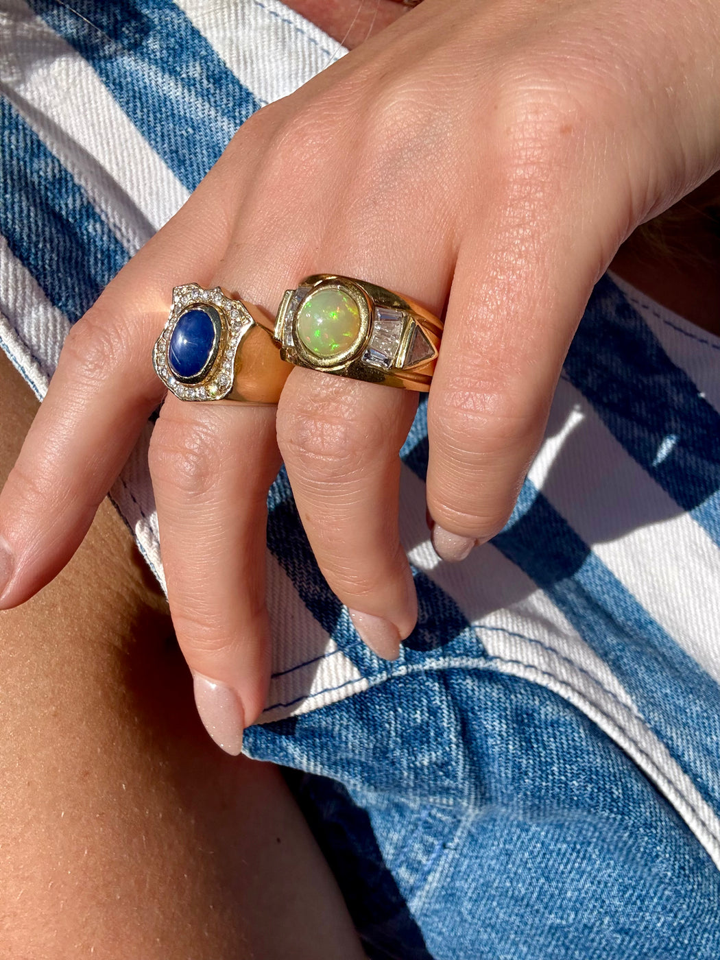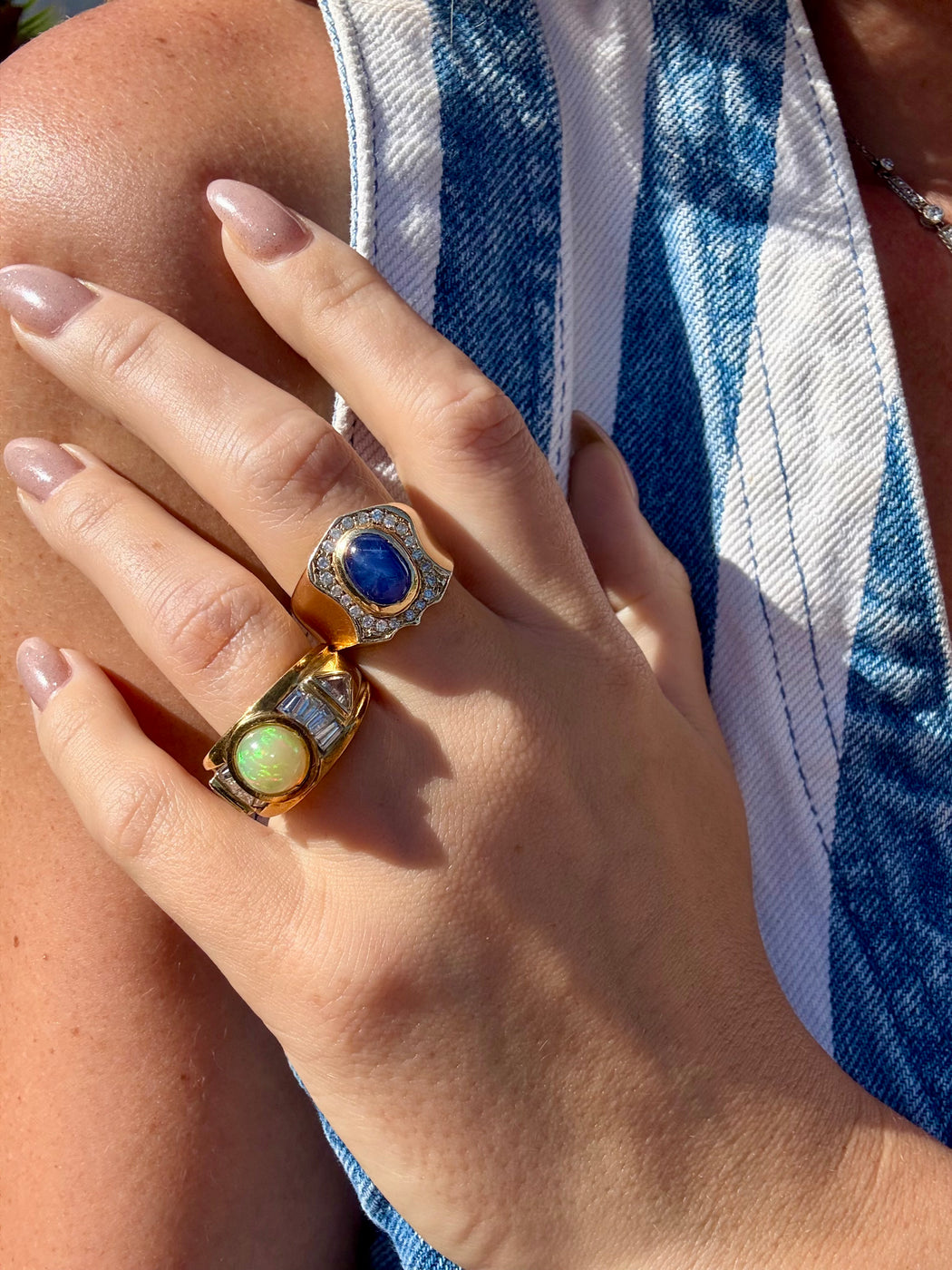 - Stones: 2.0ct Sapphire Cabochon, 0.45 ctw, 22 Round Diamonds