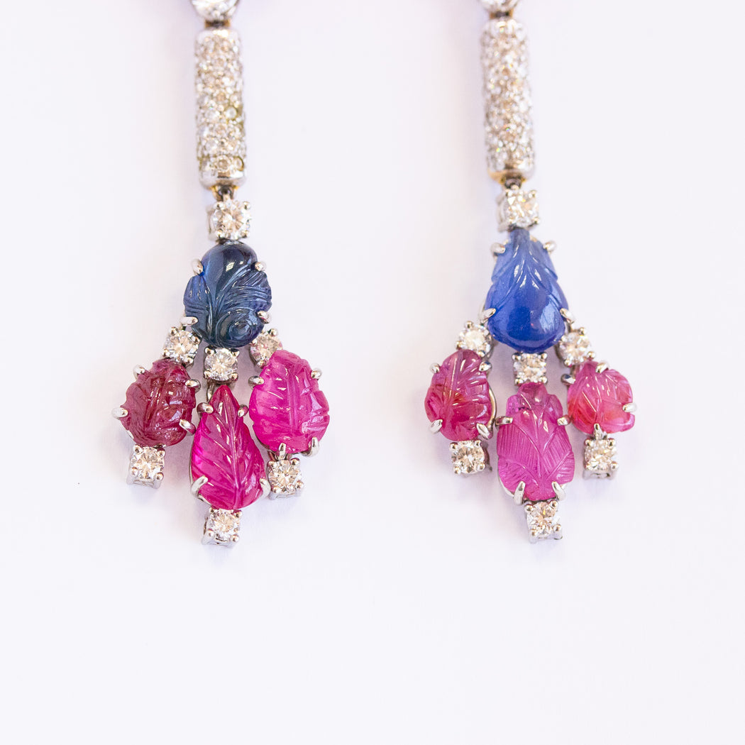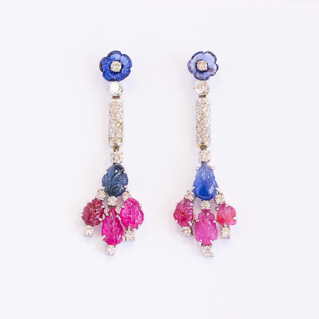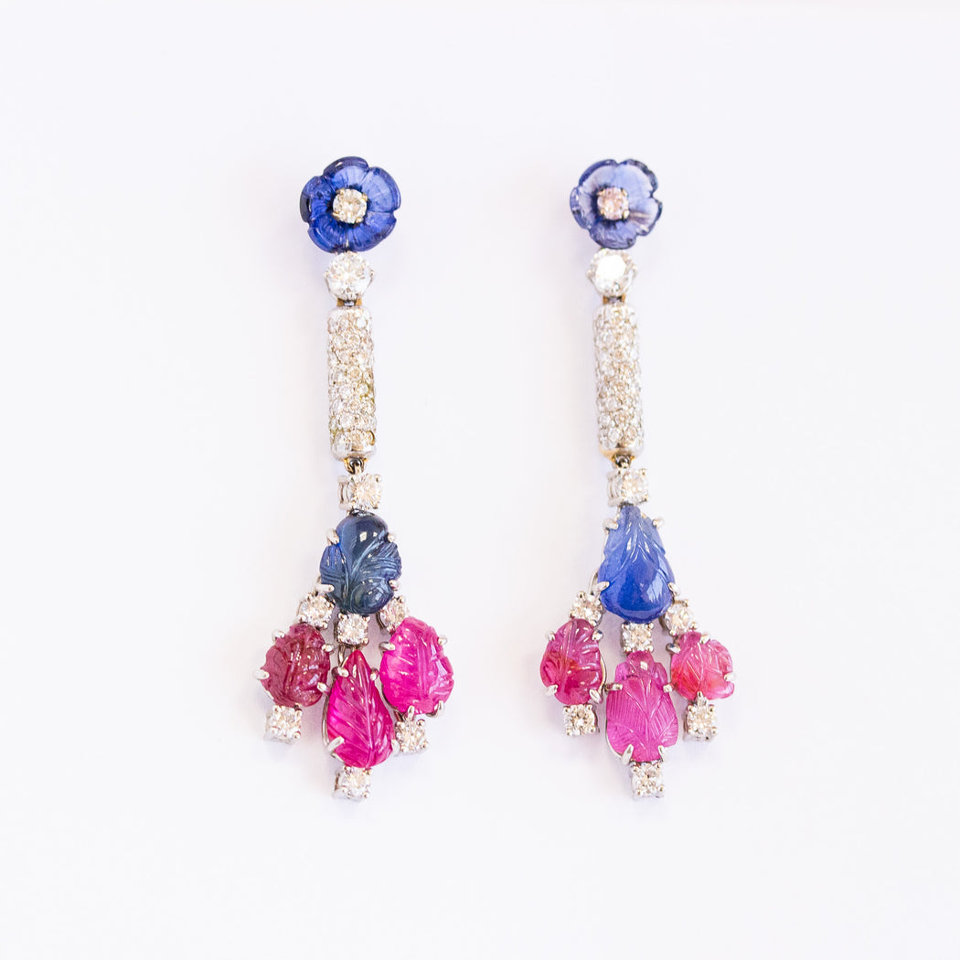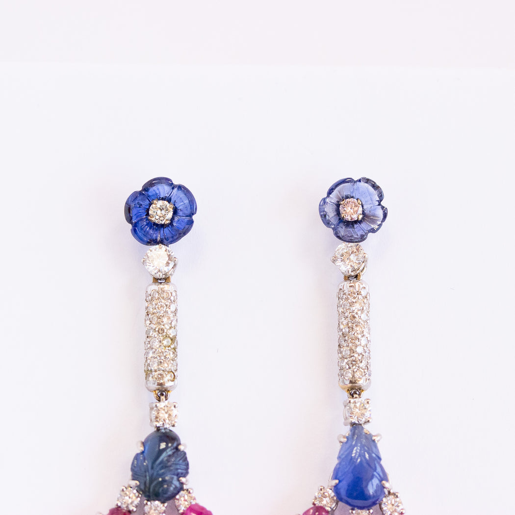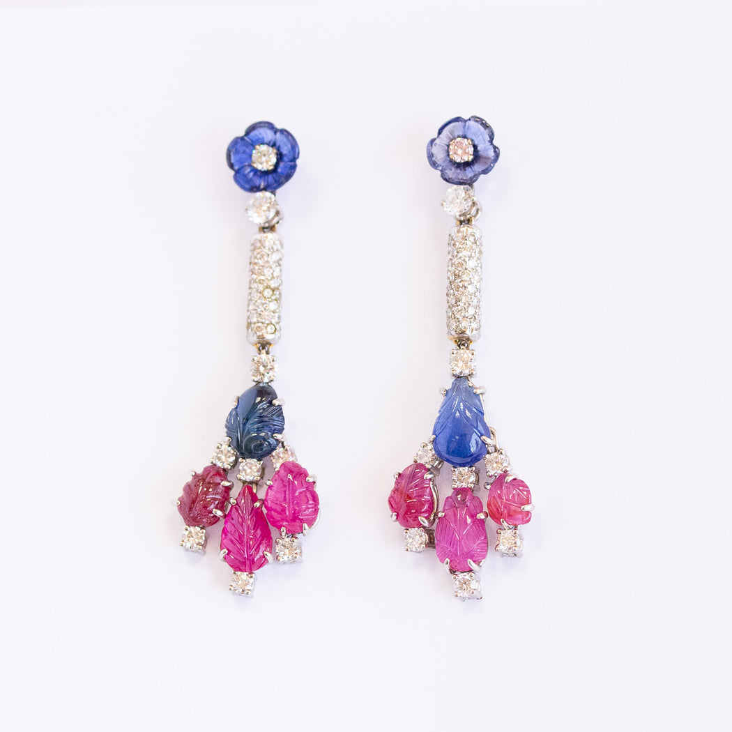 Retro Tutti Frutti Carved Ruby & Sapphire Flower Earrings with Diamonds, Platinum & 18k